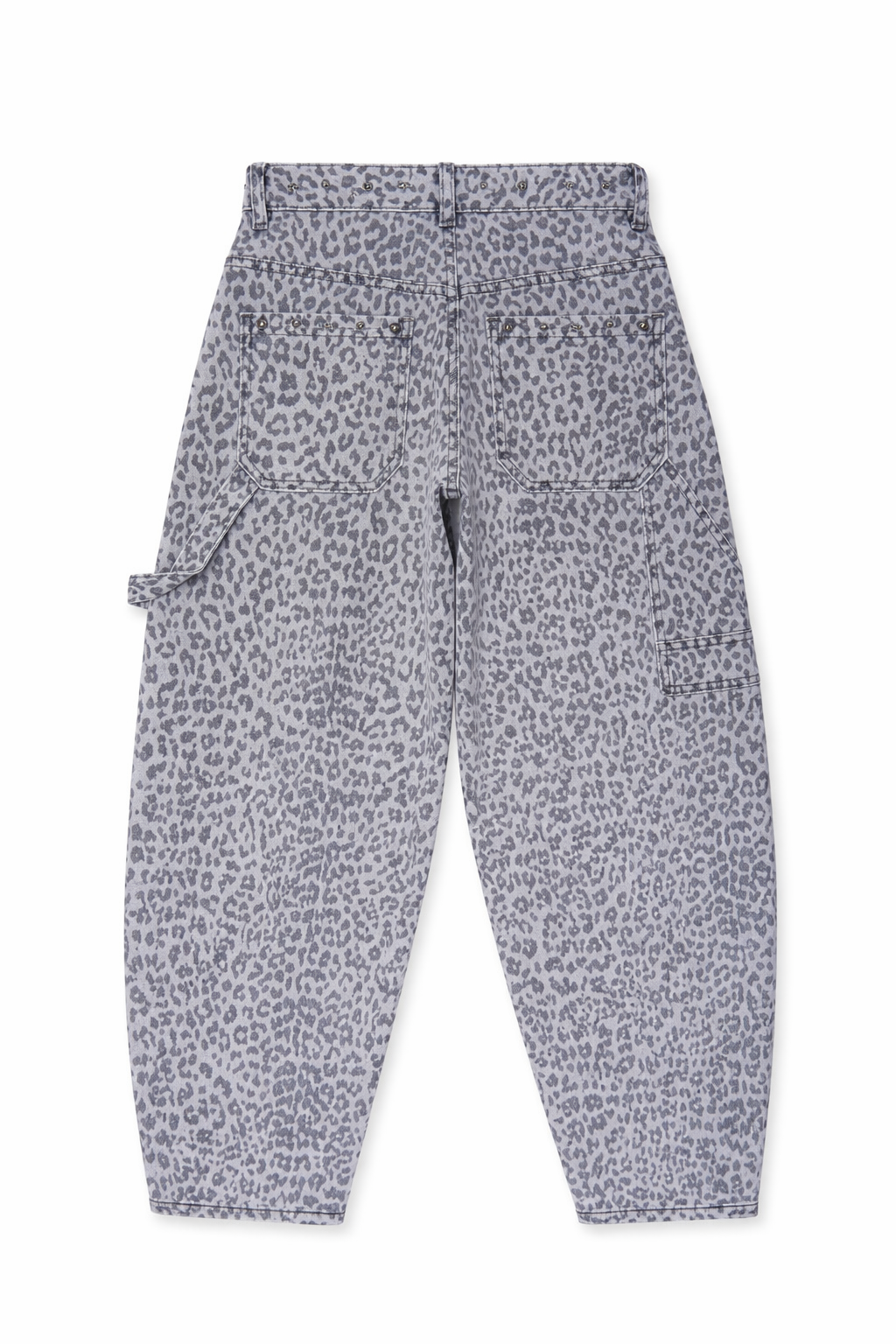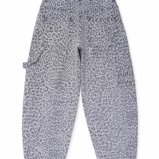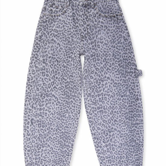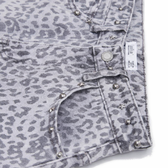 Diese außergewöhnliche Leo Jeans vereint lässigen Streetstyle mit femininen Details. Der moderne Cargo-Schnitt trifft auf ein dezentes Allover-Leo-Muster in soften Grau-Nuancen und wird durch silberfarbene Nieten veredelt. Ein echtes Statement-Piece für trendbewusste Looks – edgy, aber dennoch alltagstauglich.
