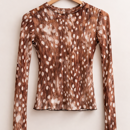 Dieses figurbetonte Longsleeve mit modernem Animal-Print vereint Trendbewusstsein mit femininer Eleganz. Das feine, semitransparente Material sorgt für eine leichte, edle Optik, während das dezente Braun-Beige-Muster dem Oberteil eine natürliche, stilvolle Ausstrahlung verleiht. Ob solo getragen oder als Layering-Piece unter Blazer, Strick oder Weste – dieses Shirt setzt modische Akzente und wirkt gleichzeitig hochwertig und alltagstauglich.
